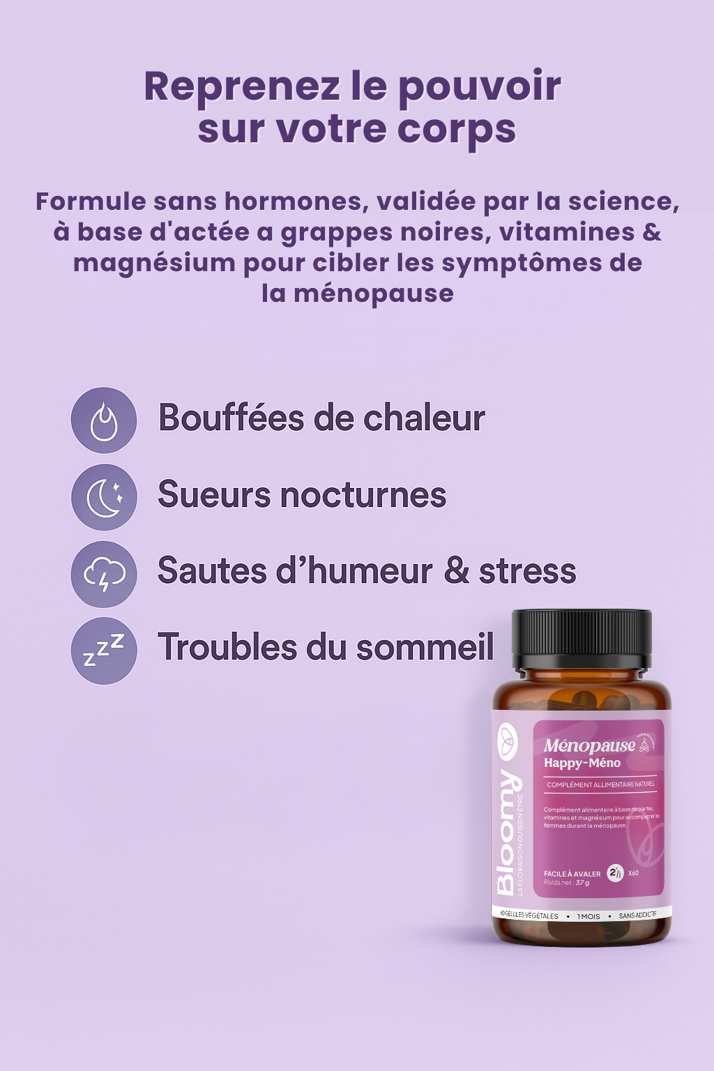 Happy-Méno est un complément moderne et sans hormones, conçu pour soulager plusieurs symptômes de la ménopause.